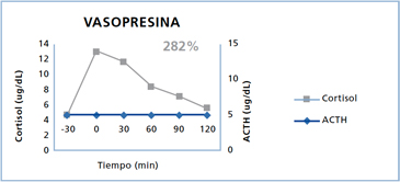 Con el diagnóstico presuntivo de HSMIA se realizó estudio funcional en busca de receptores suprarrenales eutópicos sobreexpresados o ectópicos aberrantes, utilizando pruebas funcionales para evidenciar la eventual relación de cortisol ante el estímulo o el bloqueo de los siguientes receptores: a) GIP; b) 5TH; c) AII; d) adrenérgico beta (Rß); e) AVP (Tabla 1). La prueba postural, que consiste en medir cortisol y ACTH en decúbito supino estricto y después de deambulación, demostró aumento sobre los valores de reposo, de 86% para el cortisol y 20% para ACTH (Figura 2A); esta respuesta se interpretó como positiva, sin discriminar cuál de los receptores involucrados en esta prueba (AII, ß, AVP) era el responsable del estímulo de cortisol. Para una aproximación más específica y discriminatoria, se realizaron pruebas diferenciales para cada uno. El estímulo con vasopresina (10 U im), después de dar 1 mg de dexametasona a las 23 horas del día anterior, generó un aumento de 282% de cortisol y de 0% de ACTH (Figura 2B).