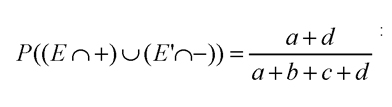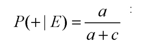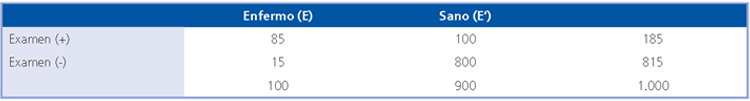 Esto es: a + c es el número total de enfermos en la población; b+d es el número total de sanos en la población; a+b es el número de sujetos cuyo examen es positivo y c+d el número de sujetos cuyo examen es negativo. Los verdaderos positivos, (enfermos y con examen positivo) son “a” y los verdaderos negativos (sanos y con examen negativo) son “d”; en forma análoga los falsos positivos (sanos con examen positivo) son “b” y los falsos negativos (enfermos con examen negativo) son “c”. Así es posible definir las siguientes probabilidades de “buena o correcta clasificación”: