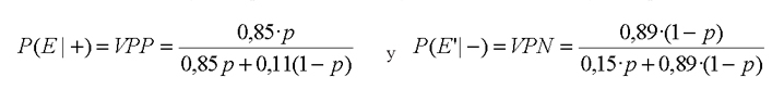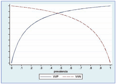 Es decir tanto el VPP y el VPN son funciones de la prevalencia, para una sensibilidad y una especificidad dadas. Por ejemplo para una sensibilidad de 0,85 y una especificidad de 0,89 (de los datos de la Tabla 3), las expresiones anteriores son: