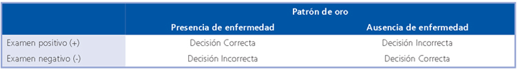 El lector recordará el inexorable cruce entre el verdadero estado de la naturaleza y la percepción que tenemos de ella; este cruce nos lleva a tomar decisiones correctas o incorrectas. En el diagnóstico el verdadero estado de la naturaleza lo revela el examen que conocemos como PATRON DE ORO o GOLD STANDARD y la percepción que tenemos de la naturaleza nos la da el resultado de un examen: POSITIVO O NEGATIVO. Esta situación se puede resumir en la siguiente tabla: