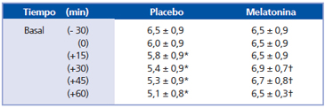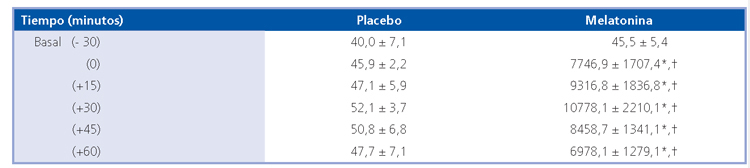 Valores corresponden a promedio ± EE. El tiempo indicado entre paréntesis corresponde al tiempo al que se inyectó ACTH (ver métodos). Melatonina fue ingerida inmediatamente después de extraída la muestra basal. *Diferente al basal (p < 0,05 ANOVA de una vía para muestras repetidas, seguido de análisis de Tukey para encontrar las diferencias). †Distinto al placebo al mismo intervalo de tiempo (p < 0,01 análisis de modelos mixtos).
