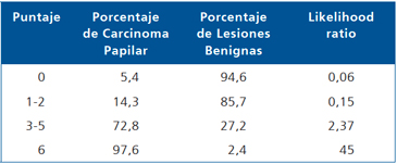 Tabla 2. Escala de puntaje predictiva para Carcinoma Papilar Tiroideo (CPT)