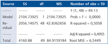 Tabla ANOVA (Source: fuente de variación; SS: Suma de cuadrados; df: grados de libertad; MS: cuadrado medio; F: valor de la estadística F; Prob>F: p-value asociado a la dócima de existencia del modelo; R-squared: coeficiente de determinación y Root MSE: estimación de la desviación estándar residual).