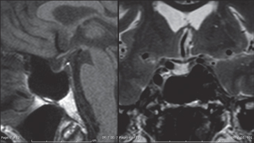 El TAC de cerebro y silla turca mostró una silla turca pequeña, con contenido hipodenso, lo cual podría corresponder a silla turca parcialmente vacía. RM: silla turca de tamaño reducido, tejido hipofisiario reducido al piso de la cavidad selar, aracnoidocele secundario (Figura 2).