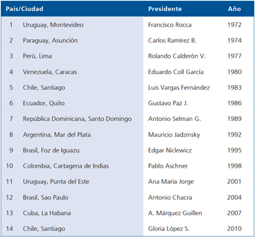 Desde 1972, año del primer congreso realizado en Montevideo, Uruguay, hasta el presente, se han efectuado catorce, los que se realizan cada tres años, siendo el último el de Santiago de Chile, en noviembre del año recién pasado. Estas reuniones constituyen el principal punto de encuentro de la diabetología latinoamericana, al que se suman destacados invitados de fuera de nuestro sub continente Latino Americano. Cada congreso ha marcado un hito de progreso y un creciente número de asistentes; el de Santiago reunió a dos mil congresales. La Tabla 1 da cuenta de las sedes de los congresos, con sus respectivos presidentes.