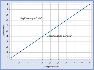 Si la discriminación fuera por azar se tendría S=1-E. Representando gráficamente estas relaciones, donde el eje de las abscisas es 1-E y el de las ordenadas S, se tiene: