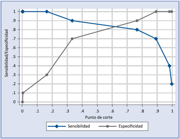 Como nuestro interés es tener buena capacidad de clasificación, es decir, alta sensibilidad y alta especificidad. Lo que se traduce en: