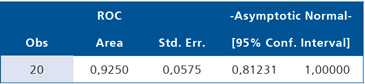 Como se sugirió, la capacidad de discriminación está dada por el área bajo la curva ROC, que en nuestro caso es 0,9250. El mejor punto de corte es aquel que está más cerca de la discriminación perfecta.
