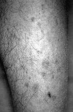 Se presenta como una o varias placas discoidales bien delimitadas, con centro atrófico de color amarillento y telangiectasias en la superficie. Los bordes son regulares, de color rojo-violáceo y con pequeñas lesiones similares a comedones. Se localizan en la superficie extensora de piernas, pies y tobillos13.