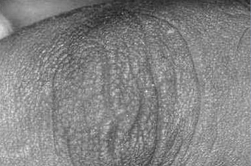 Corresponde a placas hiperpigmentadas, hiperqueratósicas, papilomatosas en zonas de pliegues (Figura 6) como axilas y cuello, pero pueden presentarse en otras áreas (pliegues inguinales, submamarios, ombligo, areolas y manos). Se ha reportado mayor frecuencia en razas de piel oscura28.