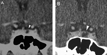 Figura 1A y B. TAC con contraste yodado, corte coronal, muestra un microadenoma lateralizado a izquierda (punta de flecha). Control a los 2 años. TAC con contraste yodado, corte coronal, demuestra aumento de volumen del microadenoma, lo que es infrecuente de observar en clínica (punta de flecha).