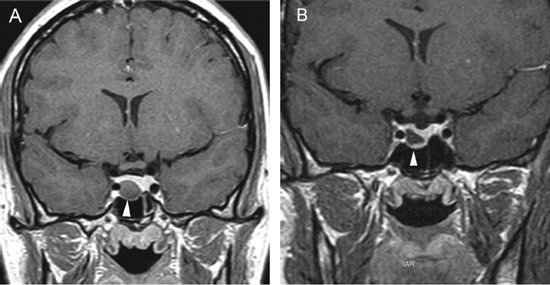 Figura 13A y B. Cortes coronales, secuencias T1w sin y con contraste. Antes de la inyección de gadolinio, el tumor se identifica a pesar de tener señal similar a la glándula (punta de flecha). El tumor muestra un borde superior convexo, se asocia con un piso selar cóncavo y a leve desviación del tallo pituitario a derecha, hallazgos que ayudan a localizarlo. Con el Gadolinio el adenoma se identifica con precisión al reforzarse la glándula pituitaria y los senos cavernosos, lo que permite visualizar la invasión del seno cavernoso izquierdo (punta de flecha).