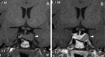 Figura 10A y B. Microadenoma pituitario (prolactinoma), secuencias T1W antes y después de contraste, cortes coronales. Sin Gadolinio el tumor tiene señal similar a la glándula pituitaria. La secuencia T1W post Gadolinio, muestra la glándula contrastada y a izquierda un tumor no contrastado, (hipointenso) de 7 mm (punta de flecha). Características de la imagen del adenoma pituitario
