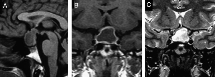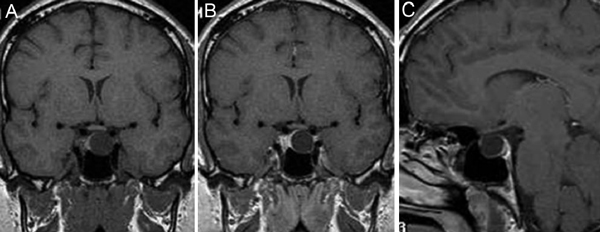 Figura 16A, B y C. Cortes coronales T1w sin y con Gadolinio y T2w. Macroadenoma con expansión asimétrica de la silla turca e invasión del seno cavernoso izquierdo.
