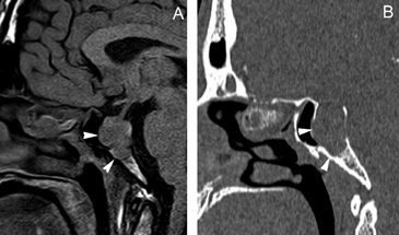 Figura 2A y B. Cortes sagitales de RM y TAC. Adenoma pituitario con invasión del esfenoides y del clivus (puntas de flecha). Es posible demostrar las estructuras óseas en RM con similar precisión que la TAC.