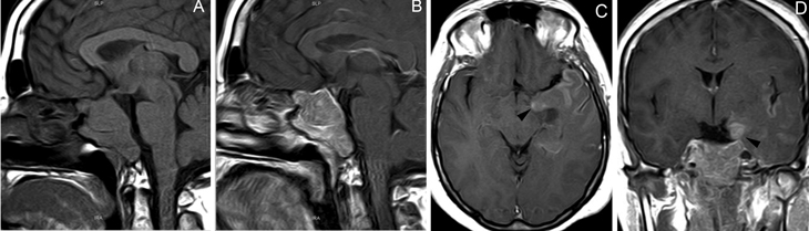 Figura 20A y B. Cortes sagitales, secuencia T1 sin y con Gad. Prolactinoma maligno que invade el seno esfenoidal, el clivus, se extiende a la cisterna supraselar. C y D cortes axiales transversal y coronal, secuencia T1w con Gad. demuestran invasión subaracnoidea y del lóbulo temporal izquierdo (punta de flecha).