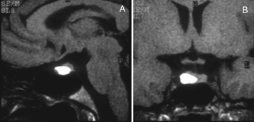 Figura 22A y B. Cortes sagital y coronal, secuencia T1w. Se observa un nódulo espontáneamente hiperintenso, resultante de hemorragia subaguda en un adenoma hipofisiario.