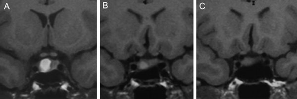 En los microadenomas el crecimiento tumoral es observado en una minoría de los casos (Figuras 1A y 1B), en contraste con los macroadenomas, los cuales cuando son encontrados en forma accidental (incidentalomas pituitarios) han demostrado un aumento de tamaño que varía entre 25 a 50%27-31.