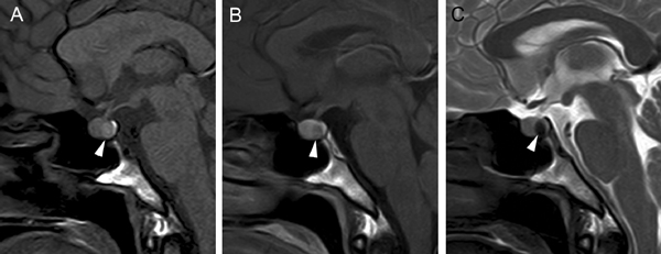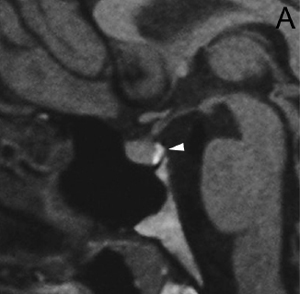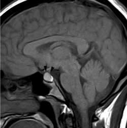 Figura 4A. Corte sagital, secuencia T1w. Glándula pituitaria normal en adulto joven (27 años), muestra foco posterior de hiperseñal de la neurohipófisis (punta de flecha); la señal de la adenohipófisis es similar a la de la protuberancia.