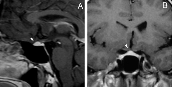 Figura 6A y B. Cortes sagital y coronal T1w con Gadolinio, muestra una glándula pituitaria que ocupa la cisterna supraselar (puntas de flecha), por insuficiente desarrollo de la silla turca.