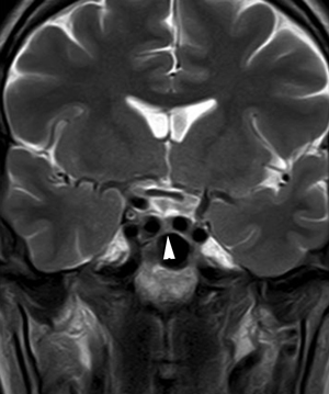 Figura 7. Corte coronal, secuencia T2w, muestra que la hipófisis ocupa la porción central de la fosa pituitaria (punta de flecha), con ambas arterias carótidas internas aproximándose a la línea media, lo que corresponde a una variante anatómica, que debe identificarse antes de realizar una cirugía por vía transesfenoidal.