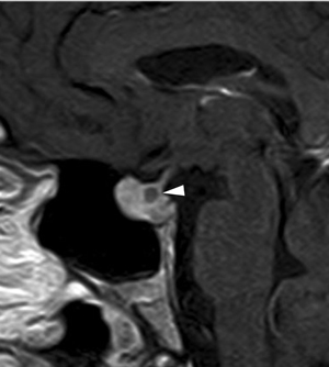 Figura 8. Corte sagital, secuencia T1w con Gadolinio, se observa un pequeño quiste de la pars intermedia (punta de flecha), inmediatamente inferior al tallo pituitario.