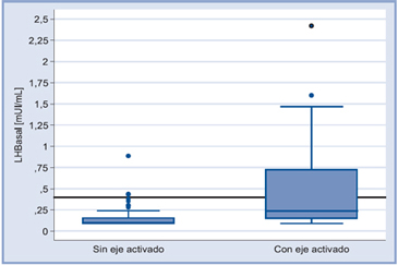La determinación de LH basal fue significativamente mayor en las pacientes con el eje HHG activado (0,5 ± 0,53 mUI/mL vs 0,15 ± 0,12 mUI/mL en las sin activación- (p: < 0,01) (Figura 1). El valor de LH estimulada también fue mayor en el grupo con el eje HHG activado (7,99 ± 9,7 mUI/ mL vs 3,88 ± 2,49 mUI/mL (p: < 0,01)).