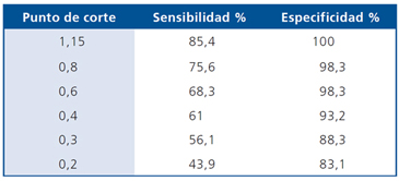 En la Tabla 1 observan los distintos porcentajes de especificidad y sensibilidad obtenidos al utilizar distintos puntos de corte de de LH basal. El 100% de especificidad sólo se obtiene con valor basal de LH > a 1,15 mUI/mL, Valores mayores a 0,4 mUI/mL de LH tenían una especificidad mayor al 93% mientras un valor basal de 0,2 mUI/mL arroja un 83,1% de especificidad, presentando todos estos puntos de corte una modesta sensibilidad.