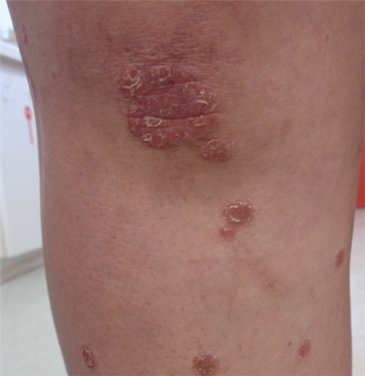 placas eritémato-descamativas en abdomen, brazos, rodillas,