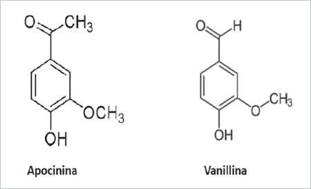 Existen diversos inhibidores de la NADPH oxidasa17,18, entre los que destaca la apocinina19. Esta molécula bloquea la translocación de p47phox desde el citosol a la membrana celular, previniendo su unión a gp91phox, y de esta forma la activación del complejo enzimático. Una molécula con alto grado de homología estructural a la apocinina es la vanillina (Figura 1), este último un ingrediente alimentario de amplio uso en humanos20. La vanillina posee actividad inhibitoria de NADPH oxidasa in vitro similar a la apocinina18. Por otra parte, recientemente demostramos que la vanillina inhibe ex vivo el “estallido respiratorio” en hígado de rata21, una respuesta mediada por la activación de la NADPH oxidasa presente en las células de Kupffer22. Finalmente, el efecto in vivo de un extracto vegetal rico en vanillina fue estudiado en ratas alimentadas con una dieta alta en grasa por 8 semanas. El grupo que recibió el extracto tuvo un perfil metabólico más favorable, caracterizado por una menor concentración circulante de glucosa, triglicéridos e insulina23.