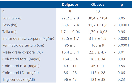 Ocho hombres delgados y 10 hombres obesos sanos (según examen físico y de laboratorio), no fumadores fueron reclutados por avisaje público (Tabla 1). Ninguno de ellos practicaba actividad física regularmente (> 60 min/semana), estaba sometido a dieta para modificar la masa corporal, o consumía fármacos y/o suplementos nutricionales. El estudio fue aprobado por el Comité de Ética de la Facultad de Medicina, Universidad de Chile, y los voluntarios firmaron el consentimiento informado previo a su participación.