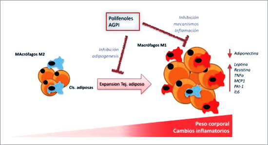 Se deben realizar esfuerzos para reducir la incidencia de obesidad y diabetes tipo 2. Posiblemente, se pueden lograr mejores medidas apuntando a inhibir el establecimiento del estado inflamatorio en el TAB. Por lo tanto, nuevas estrategias o compuestos específicos que sean capaces de disminuir esta inflamación son altamente avaluados. Se ha descrito evidencia que conecta la reducción del estado inflamatorio con una disminución en el estado de obesidad. Más aun, se ha descrito que una baja de peso inducida ya sea por intervención dietaria o cirugía bariátrica, disminuyen los niveles de marcadores de inflamación en plasma. En este sentido numerosos compuestos naturales antioxidantes han sido utilizados para combatir la inflamación ligada a obesidad. Así, el sondeo de compuestos que puedan presentar efectos beneficiosos en la comunicación adipocito-macrófago, corresponde a una aproximación aplicada e interesante para contrarrestar este estado y evitar el desarrollo de, por ej., diabetes tipo 26.