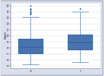 Figura 1. Gráfica de barras y bigotes que muestra la relación entre la mediana y rango intercuartílico de los niveles de HbA1c en pacientes con (1) y sin (0) ITU.