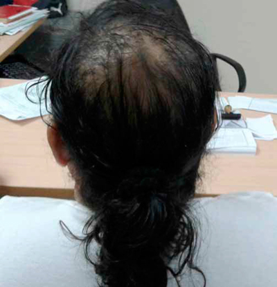 Paciente femenina de 67 años de edad con antecedentes de HTA (Hipertensión Arterial); DM2 (Diabetes Mellitus Tipo 2) complicada con polineuropatía e insulinotratada. Al interrogatorio no señaló uso de medicamentos con efecto androgénico. Presentó la menarquia a los 13 años con reglas siempre regulares, 2 gestaciones y menopausia a los 50 años. Acude a consulta de endocrinología refiriendo preocupación por calvicie frontotemporal y de la región del vértex, que pueden apreciarse en las figuras 1 y 2. Desde hace aproximadamente 1 año comenzó a depilarse con frecuencia semanal. Comentó además aparición de vello terminal en línea intermamaria y región alta de la espalda. Al examen físico presentó Obesidad grado II (Índice de masa corporal 35.4), TA (tensión arterial) 238/104, índice de hirsutismo igual a 16, moderado (según clasificación de Ferriman-Galwey), alopecia androgénica, tamaño del clítoris 9 mm, pérdida de contorno corporal femenino.
