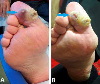 A 74-year-old male patient refers a bullous lesion in the right hallux for one day, painlessly, without signs of inflammation. Refers type 2 diabetes mellitus (DM2) for ten years treated with diet. Started treatment with januvia and metformin two years ago. The glycaemia, even with drug treatment, remains at a level between 140-180 mg/dl. Denies surgeries and trauma.