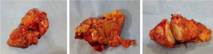 Es valorado por el equipo de cirugía hepato-biliar y se programa abordaje quirúrgico con impresión diagnóstica de insulinoma, se indica vacunación pre quirúrgica para neumococo dada la posibilidad de esplenectomía según la extensión de la lesión en los hallazgos operatorios. Se realiza cirugía con hallazgos intra operatorios de lesión tumoral en el cuello del páncreas de 3 x 3 cm aproximadamente, adherido a vasos esplénicos, el cual es resecado sin complicaciones (Figura 2), no se evidencia compromiso ganglionar retroperitoneal ni otras lesiones. Requirió vigilancia post operatoria en la unidad de cuidados intensivos (UCI) con evolución clínica satisfactoria por lo que se dio egreso al día 17 de hospitalización.