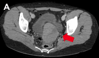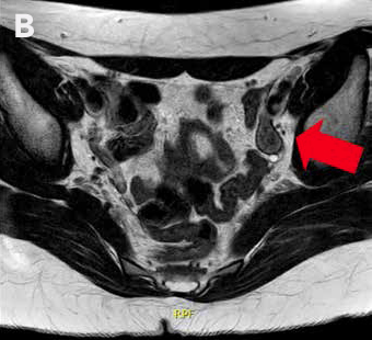 Mujer de 27 años, con antecedente de amenorrea primaria con hábito femenino, mamas Tanner V, escaso vello no terminal axilar y púbico, y que tenía pareja heterosexual y vida sexual normal. Sus exámenes hormonales demostraron testosterona en rango masculino (Tabla 1) y cariograma 46,XY compatible con insensibilidad a andrógenos. La TAC de pelvis mostró ausencia de útero, una imagen ovoidea con densidad de partes blandas de 27 mm de diámetro mayor a nivel de la bifurcación de los vasos iliacos derechos interpretada como ovario normal, y en situación anexial izquierda una masa sólida de 90 mm de diámetro mayor, bien delimitada algo heterogénea sin calcificaciones, sin liquido libre ni adenopatías (Figura 2). Fue sometida a gonadectomía bilateral 4 años antes de la consulta y la biopsia demostró un seminoma espermatocítico de 11 cm asociado a un foco de neoplasia germinal intratubular de 2 mm en la gónada izquierda y un testículo atrófico y fibroso, con epidídimo de aspecto conservado a derecha.
