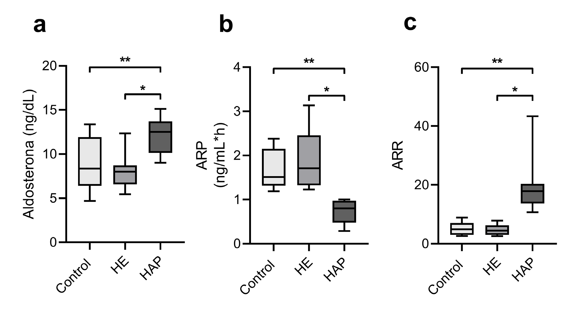 El grupo control incluyó 13 sujetos, de los cuales 6 fueron hombres y 7 mujeres, el grupo HE incluyó 12 sujetos de los cuales 8 fueron hombres y 4 mujeres, y el grupo HAP incluyó 13 sujetos de los cuales 7 fueron hombres y 6 mujeres. En el grupo HAP, se observó mayor PAD (86 [76-95] vs 84 [81- 91] vs 75 [71-76] mmHg, p= 0,0003) y PAS (141 [129-153] vs 134 [123-139] vs 116 [110-121] mm Hg, p= 0,0005) que el grupo HE y control respectivamente (Tabla 1). El grupo HAP mostró una mayor concentración de aldosterona que el grupo HE (12.7 [10.4-13.7] vs 8.0 [6.6-8.7] ng/dL, p= 0,0019) y el grupo control (12.7 [10.4-13.7] vs 8.4 [6.4-11.9] ng/dL, p= 0,0149) (Figura 1a). Por otro lado, la ARP fue menor en el grupo HAP que en el grupo HE (0.8 [0.5-1.0] vs 1.7 [1.3- 2.5] ng/mL*h, p= 0,0001) y el grupo Control (0.8 [0.5-1.0] vs 1.7 [1.3-2.3] ng/mL*h, p= 0,0001) (Figura 1b). Cuando se comparó la ARR, se observó diferencias significativas entre el grupo HAP y el grupo HE (17.5 [13.1-20.1] vs 4.5 [3.0-6.3], p= 0,0001), y entre HAP y el grupo control (17.5 [13.1-20.1] vs 4.9 [3.1-7.0] p= 0,0001) (Figura 1c).