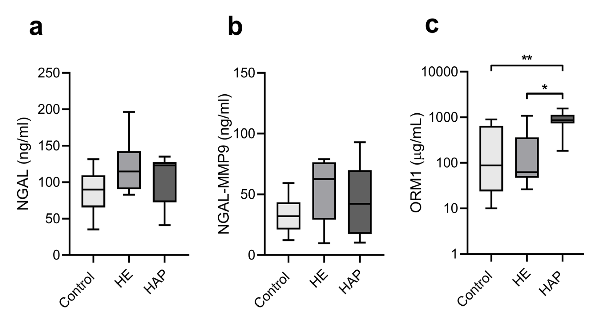 la concentración de ORM1 en suero de sujetos HAP en comparación al grupo HE y Control. b. Concentración sérica del complejo NGAL-MMP9 en sujetos HAP,