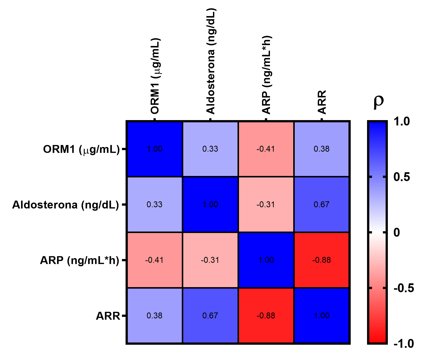 Se realizó un estudio de asociación de la concentración de ORM1 en suero, con parámetros clínicos y bioquímicos de tamizaje de HAP (Aldo sterona, ARP y ARR). Se observó una asociación positiva entre la concentración de ORM1 y la concentración de aldosterona (rho=0,33, p=0,05) y ARR (rho= 0,380 p= 0,021) (Figura 3). Por otro lado, se detectó una asociación negativa entre concentración de ORM1 con la ARP (rho= -0,407, p=0,012) (Figura 3). No se observó asociaciones significativas entre la concentración de ORM1 con ninguna otra característica clínica ni bioquímica (Tabla 1). No se observaron asociaciones significativas entre la concentración de NGAL con los parámetros clínicos y bioquímicos de la tabla 1 ni con ORM1.