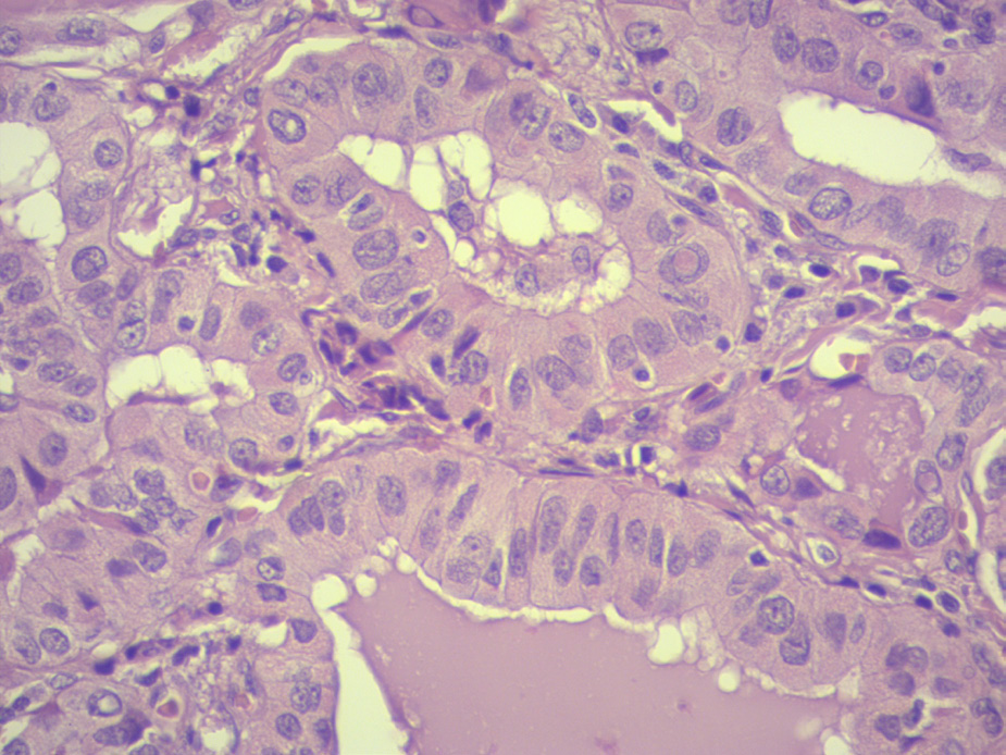 El cáncer diferenciado de tiroides representa el 90% de todos los tipos de cáncer tiroideos1. El cáncer papilar (CP) constituye aproximadamente el 80% de todos los casos de cáncer de tiroides y el 85% de los tumores diferenciados2. En general los CP se asocian a buena supervivencia, baja tasa de invasión local, recidivas o metástasis. Sin embargo, algunas variantes de éstos pueden comportarse de manera más agresiva con características clínicas, patológicas y moleculares propias. Estos subtipos histológicos se consideran según la American Thyroid Association (ATA) de mayor riesgo de recurrencia, metástasis y en algunas oportunidades con baja respuesta al tratamiento con radioyodo3. Entre las variantes más agresivas de CP se encuentran la esclerosante difusa, células altas, células columnares, patrón sólido y la de células prominentes en forma de tachuela4,5. La variante de células altas (VCA) se define como tal cuando éstas representan al menos el 30-50% del universo celular del tumor, siendo sus células al menos dos veces más altas que anchas, con abundante citoplasma eosinofílico6.