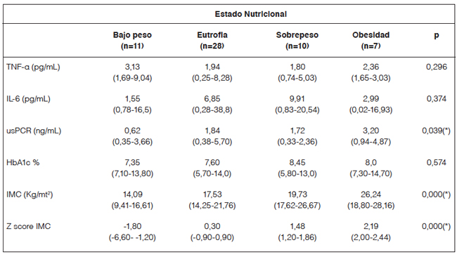 No se observaron diferencias significativas al analizar la asociaoción entre los niveles de los marcadores inflamatorios TNF-α e IL-6 y el estado nutricional (Tabla 1). Tampoco se observaron asociaciones entre los marcadores inflamatorios TNF-α, IL-6 y el zIMC.