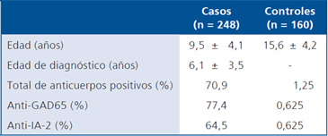 Los anticuerpos anti-GAD65 y anti-IA2 fueron determinados mediante inmunoensayo enzimático (ELISA) con el uso de kits comerciales (Medizym® Diagnostic, Berlín, Germany). Esta detección de anticuerpos es semi-cuantitativa y establece puntos de corte frente a una curva de calibración considerando, como referencia el valor de 5 UI/mL para GAD65 y 10 UI/mL para IA2. Aquellas muestras con un título mayor o igual a dicho valor fueron consideradas muestras positivas. Se obtuvo una sensibilidad y especificidad del 92,3% y 98,6% para anti-GAD65 y de 75% y 98% para anti-IA-2.