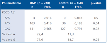 El gen PD-1 y sus proteínas ligando tienen un importante rol en la inducción y/o mantención de la tolerancia periférica. A través de la interacción con sus ligandos (PDL1 y PDL2), se inhibe la estimulación antigénica de las células T y B, estos ligandos pertenecen a la familia de proteínas B7 y se expresan en órganos linfoides, como no linfoides. El balance de señales inhibitorias (PD-1 y CTLA-4) y de estimulación (B7) genera interacciones entre la superficie celular de los linfocitos T y las células presentadoras de antígenos y corresponden a mecanismos cruciales de la homeostasis celular de la tolerancia periférica16. El gen humano para PD-1, localizado en el cromosoma 2q37 presenta varios polimorfismos de nucleótido simple (SNPs) asociados con autoinmunidad: Lupus eritematoso sistémico (LES), artritis reumatoidea (AR), tiroiditis y DM117. Los estudios de polimorfismo genético en pacientes con DM1 han mostrado resultados controversiales según la población analizada18-21. El objetivo de esta investigación fue analizar la frecuencia y posible asociación del polimorfismo PD-1.3 con la DM1 en un grupo de pacientes chilenos.