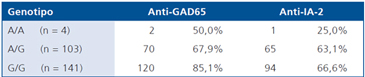 Finalmente, la Tabla 3 muestra los resultados del estudio de asociación entre genotipos PD-1.3 y marcadores inmunológicos característicos de la DM1. Dada la baja frecuencia del genotipo A/A el resultado es solamente referencial, puesto que su baja distribución impide realizar comparaciones. Sin embargo, para los genotipos A/G y G/G se observa una mayor frecuencia de anticuerpos positivos. El genotipo G/G se asocia a un porcentaje mayor de anti-GAD65 (85,1%) y al mayor porcentaje de anti-IA-2 (66,6%).