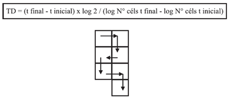 Tiempo que demora un cultivo en doblar el número de células. Contando con cámara de neubauer (conteo celular) y según método de Caviedes y cols en placas de 35 mm10.