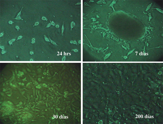 El medio de cultivo se cambió cada 3 días o según necesidad, por viraje del marcador de pH (rojo fenol). Para los subcultivos se utilizó método enzimático con tripsina 0,2%. Se controló los cultivos por microscopía invertida de contraste de fases.