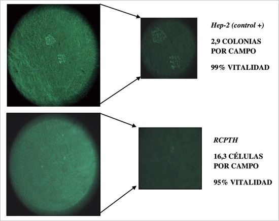 La línea RCPTH demuestra en diversos análisis no tener característica de célula tumoral. Crece en monocapa, tiene inhibición por contacto, tiene baja tasa de mitosis, bajo porcentaje de incorporación de análogos de timidina (BrDU) y no presenta formación de colonias en condiciones de suspensión celular (crecimiento en agar blando).