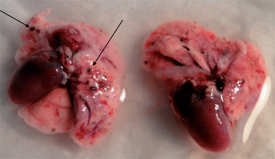 En el grupo control se llevó a cabo una única inoculación por animal con 1 millón de células de la línea de melanoma Mel2, en 100 uL de suero fisiológico estéril por vía i.v. en las venas laterales de la cola del animal. Fue necesario sacrificar los animales luego de 15 días de la inyección de las células de melanoma. Se observaron múltiples nódulos intra y extra pulmonares, de hasta 1 mm de diámetro de color café-negro y bordes irregulares (Figura 11).