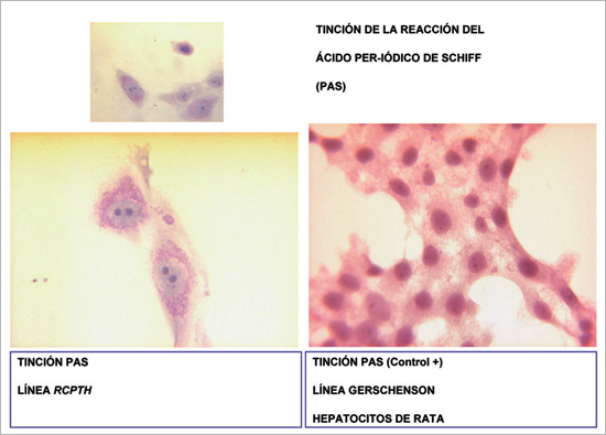 Para este experimento se incuban células RCPTH sobre cubreobjetos. Primero se agrega el ácido periódico (0,5% en agua destilada) sobre las células lavadas previamente con PBS, por 5 min. Se lava con agua corriente y luego con agua destilada. Se continúa con la incubación con el reactivo de Schiff (Fucsina básica 1g, HCl N 20 ml, Bisulfato sódico anhídrico 1 g en 200 ml de agua destilada) por 15 min y luego se realizan baños de ácido sulfuroso (Metabisulfito sódico al 10% 6 ml, HCl N 5 ml en 100 ml de agua destilada) por 3 veces (2 min cada vez). Se deshidrata las células en batería de alcoholes y se monta para visualización en microscopio óptico.